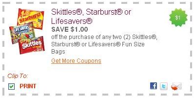 You can print a coupon for $1/2 Skittles, Starburst or Lifesavers Fun Size Bags. It' not too early to start stocking up for Halloween!