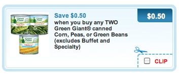 $0.50/2 Green Giant canned Corn, Peas, or Green Beans (excludes Buffet and Specialty)